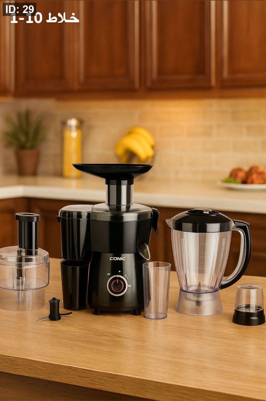 ل يحتوي الجهاز على 10قطع متعددة لكل قطعه منها وظيفة ل يحتوي على عصاره مصممه لعصير الجزر والفواكه ل يوجد قطعه مصممه لعصير العنب توضع بداخل الخلاط ل يوجد مطحنه مصممه لطحن القهوه والحبوب والمسكرات
